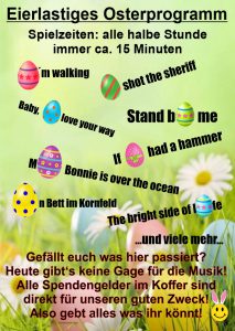Ich unterstütze als Lehrer den Stand meiner Klasse, die am Ostermarkt tolle kulinarische selbstgemachte Sachen (vom Muffin bis zum Hot“rabbit“) verkauft. Dabei spiele ich alle halbe Stunde ca. 15 Minuten