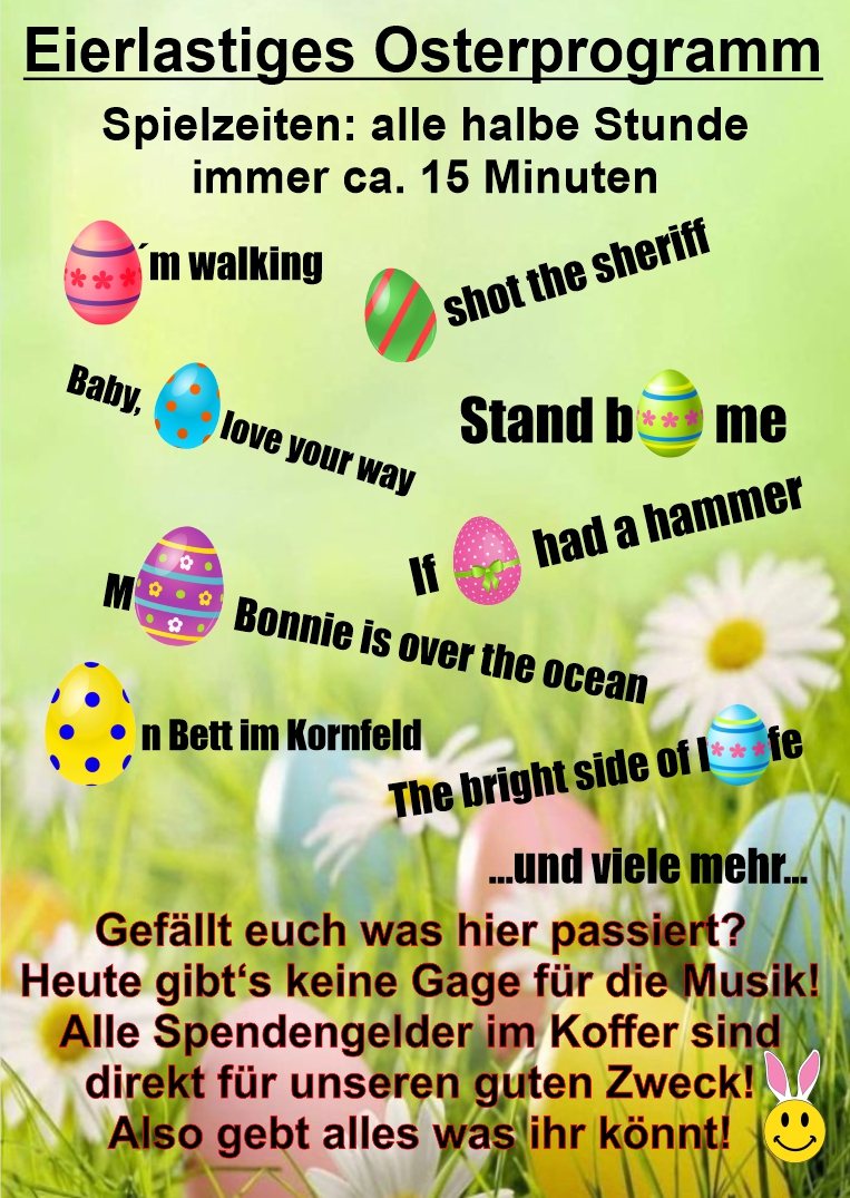 Ich würde mich sehr freuen, wenn ich euch auf diesem großen, wirklich auch sonst sehr sehenswerten Ostermarkt begrüßen könnte und ihr die Klasse mit ein bisschen Geld oder einem Einkauf von Essen und Getränk unterstützt! Oder idealerweise esst und trinkt ihr was während ihr mir zuhört und legt dann am Ende was in den Koffer…
