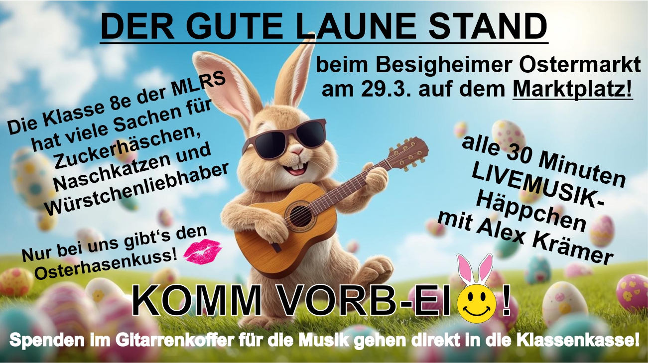 Ich unterstütze als Lehrer den Stand meiner Klasse, die am Ostermarkt tolle kulinarische selbstgemachte Sachen (vom Muffin bis zum Hot“rabbit“) verkauft. Dabei spiele ich alle halbe Stunde ca. 15 Minuten am Besigheimer Marktplatz ein bisschen Livemusik. Die Straßenmusik-Koffergage geht komplett in die Klassenkasse und soll für eine tolle Abschlussfahrt sein!
